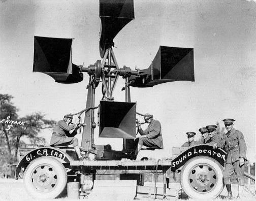 Large hearing aids were used to locate attacking aircraft. The operator listened to the two horns separated horizontally and swung them around to determine the bearing of the target; then he used the horns separated vertically to determine the elevation of the target. Next he read off the elevation and the bearing and passed it to the searchlight operators and the gunners.